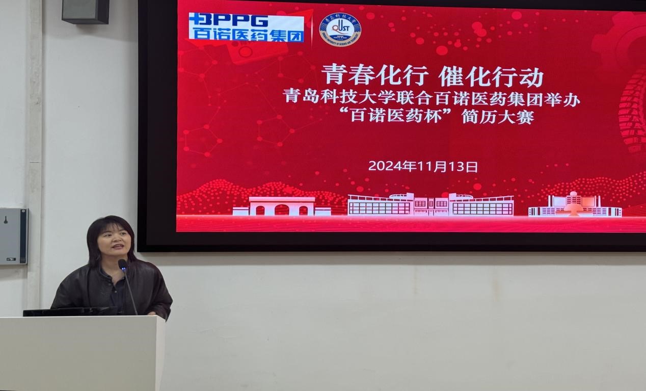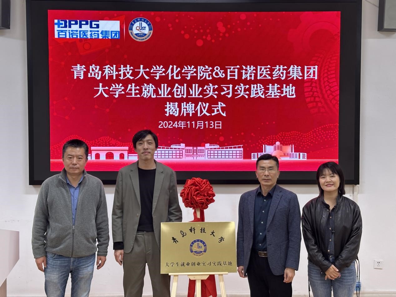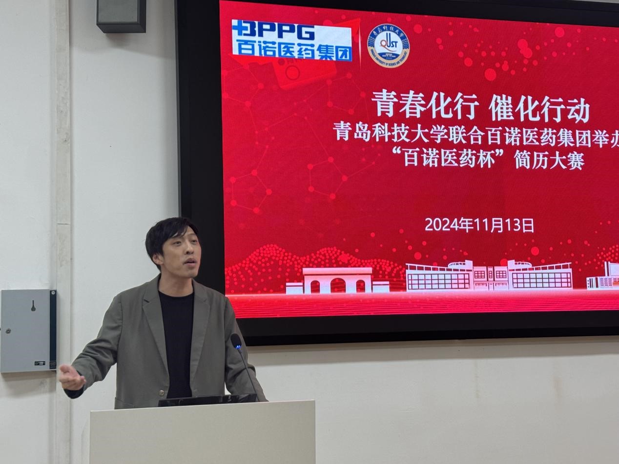 为落实《中共中央国务院关于实施就业优先战略促进高质量充分就业的意见》要求,深化校企合作、助力学生就业,2024年11月13日下午,化学院与百诺医药集团在青岛科技大学四方校区举行了大学生就业创业实习实践基地揭牌仪式暨青春化行——“百诺医药杯”简历大赛决赛。百诺医药集团人力资源中心总监邢望,百诺医药集团研究院人力资源部经理王倩倩,化学院党委书记肖强,化学院党委副书记兼副院长刘尧及部分辅导员老师出席了仪式,仪式由徐鑫主持。