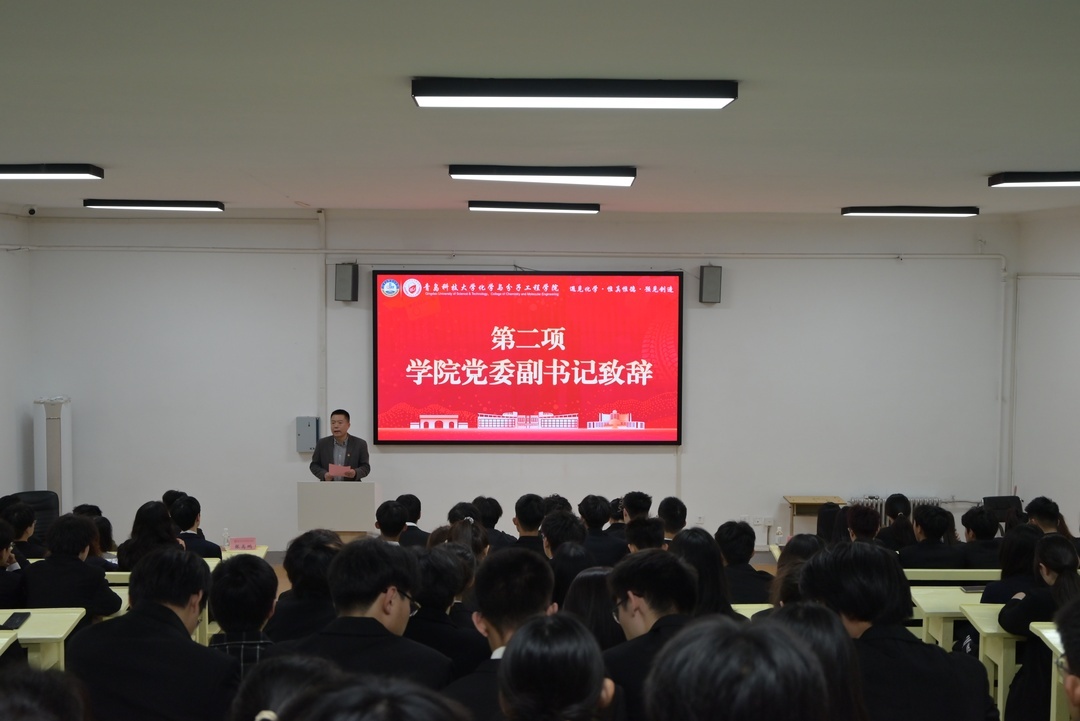 刘尧上台致辞、昝祺祺宣读《化学院2024-2025学年青马工程培训班实施方案》、学员代表上台发言,表达参加培训的决心和信心。