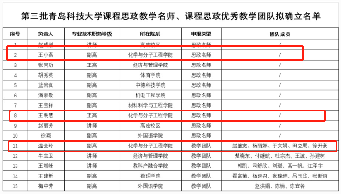近日,青岛科技大学公布第三批课程思政教学名师与优秀教学团队评选结果。学院王小燕、王明慧和温会玲领衔的教学团队成功入选课程思政教学名师、课程思政优秀教学团队。此次全校共确立教学名师10名、优秀团队5个,学院教师们凭借在专业课程思政建设中的创新实践脱颖而出。