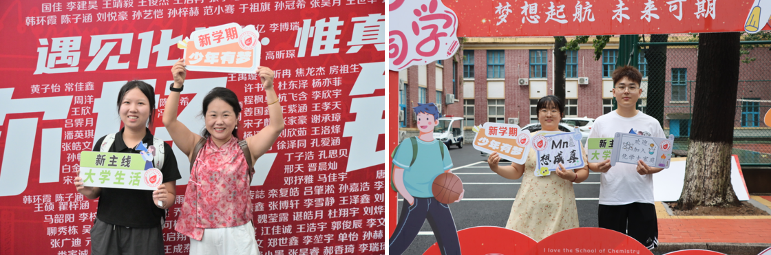 遇见化学启新程。新生踏入学校的那一刻,新的征程便拉开序幕。为拓宽新生及家长对化学院了解的渠道,学院在迎新点引导新生关注“微观化院”微信公众号,并邀请新生和家长在“你好,锌铜学!”主题喷绘前留影,镌刻下踏入青科大的第一份纪念。现场还举办“青春寄语”活动,引导新生与家长共同书写梦想明信片,等待四年后启封验算成长的轨迹。