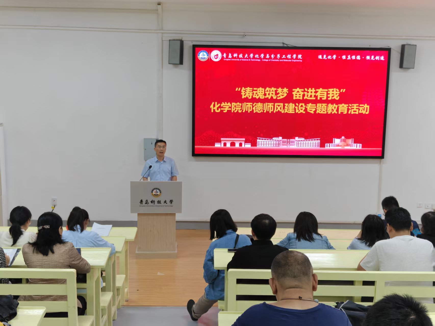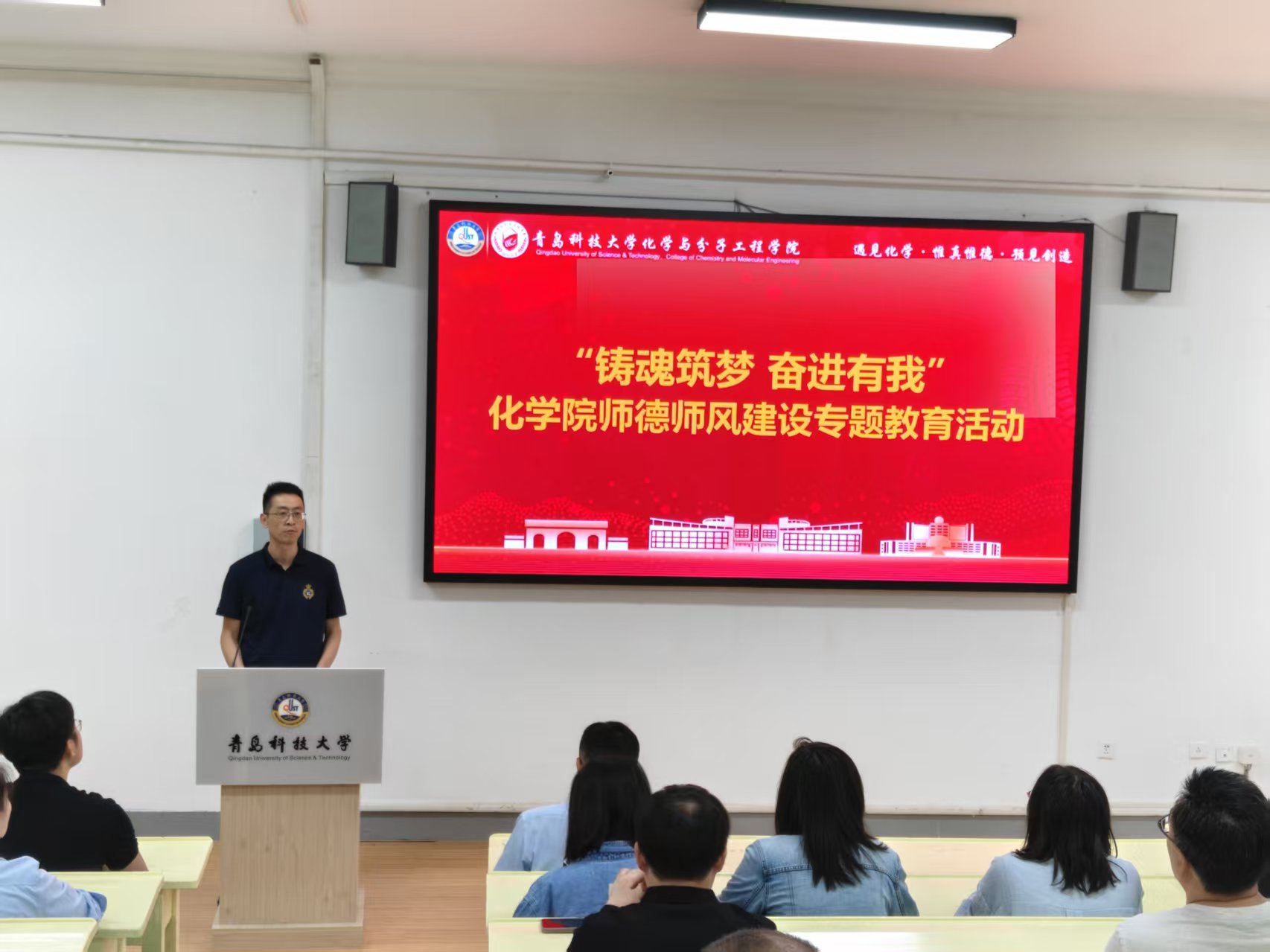 学院党委书记肖强带领全体教师学习了《新时代高校教师职业行为十项准则》,并传达了《青岛科技大学师德失范行为处理办法》等文件精神。同时,结合高校教师师德失范行为警示教育案例进行警示教育,鼓励大家明确高校教师职业规范和职业底线,落实新时代高校教师“立德树人”根本任务,践行“惟真惟德”院训。