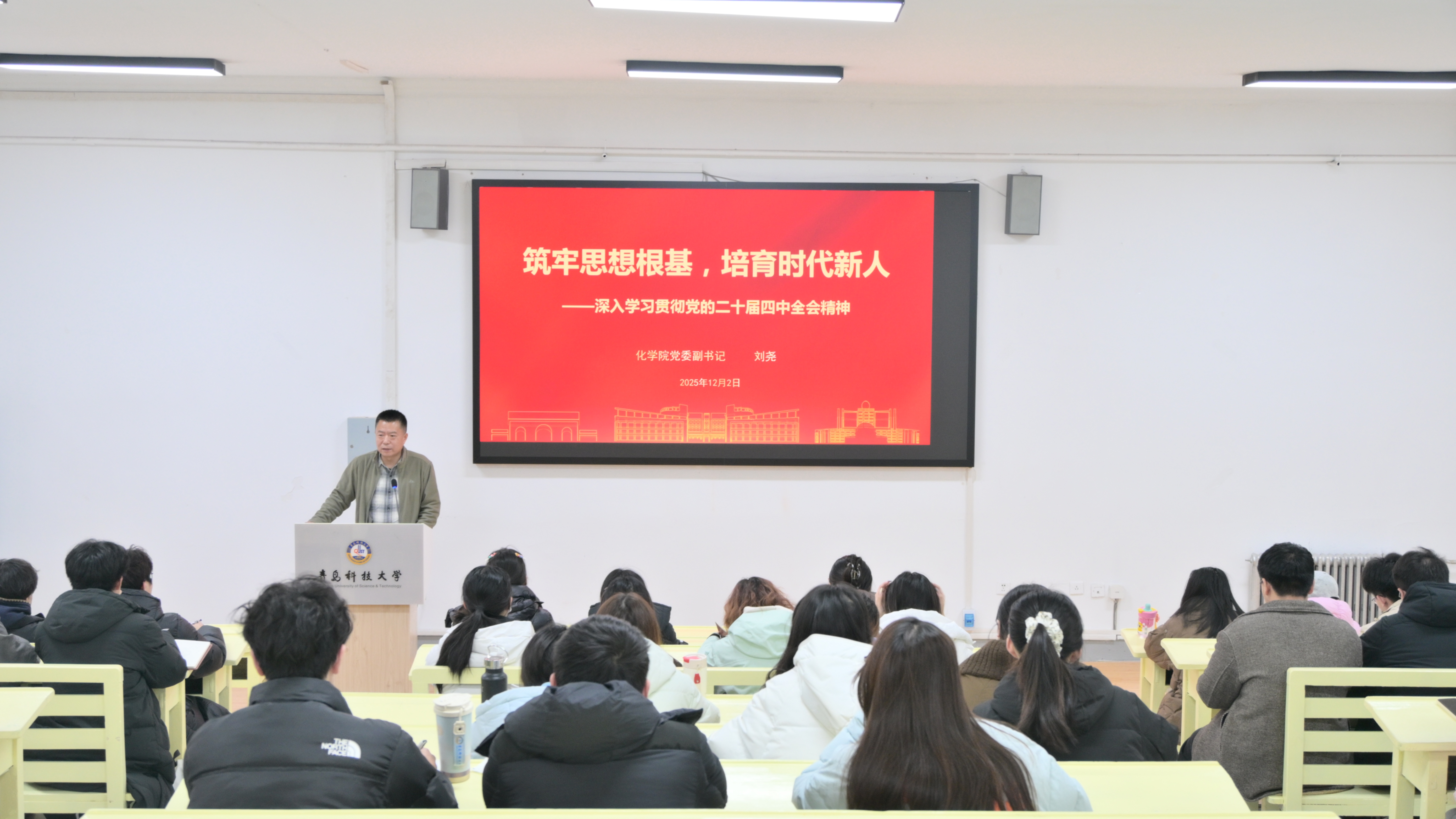 为深入学习贯彻党的二十届四中全会精神,引导学生党员切实把思想和行动统一到党中央决策部署上来,12月2日下午,学院在一政243开展“筑牢思想根基,培育时代新人——深入学习贯彻党的二十届四中全会精神”专题党课,党课由学院党委副书记兼副院长刘尧主讲,全体本科生党员参加。