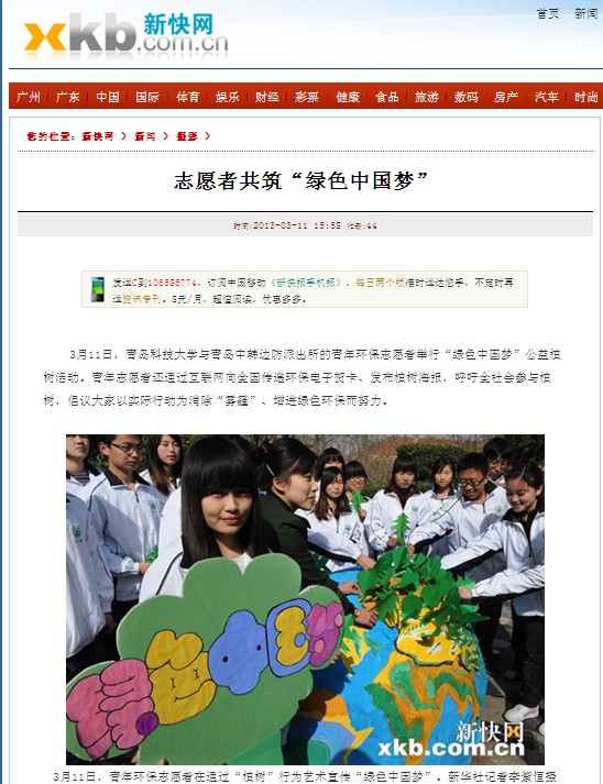 化学院学生和边防派出所警官用废旧的床单、被罩,手工做成圆形的地球,地球上突出了中国的版图,从不同省份的大学生和武警中遴选出来自全国各地的代表,共同制作手工树,并将“绿树”种植在自己的家乡版图上。手工树的地球被大学生和边防武警包围在中间,寓意在当前“中国梦”的大背景下,来自全国各地的大学生和边防武警代表,带着自己的梦想,立志在自己的家乡所在地,力所能及的植树造林,强化地球之肺,为祖国的绿色大好河山,贡献微薄之力。活动进行过程中,新华社记者李紫恒给予了积极评价,并用手中的相机记录了活动的整个过程,此外齐鲁晚报、半岛都市报、崂山区电视台现场报道了本次活动,海科112班范玲芳在接受采访中说道:大学生与边防武警还通过互联网向全国传递环保电子贺卡、发布植树海报,呼吁全社会参与植树,倡议大家以实际行动为消除“雾霾”、增进绿色环保而努力。1、《新华每日电讯》:中国梦的世界对话