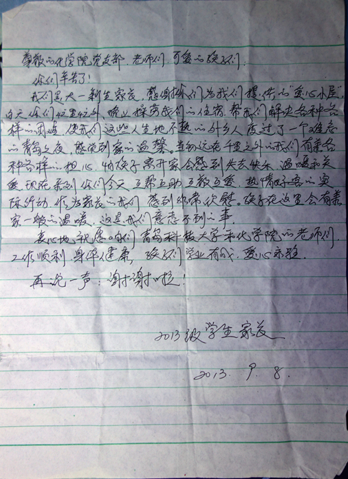 9月11日,化学院分团委收到一封从湖北寄来的感谢信,寄信人是一名今年刚刚入学的新生家长,信中表达了对学校和学院迎新工作的感谢,特别表达了对“爱心小屋”温馨服务的感谢。