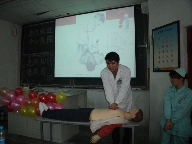 活动开始前,腾伟向同学们介绍了学校和医院良好的合作共建关系,向长期以来定期到医院做义工的化学院感恩社志愿者表示了感谢,并向他们颁发了“2013年优秀社会志愿者”的证书。讲座中,于波涛医生就如何拨打120、现场第一时间急救的意义、现场急救的基本流程、常见急危症的现场急救、正确处置伤员体位、伤员检伤方法、现场心肺复苏操作技术、创伤四项急救技术(止血、包扎、骨折固定、搬运)、现场就便器材的使用和现场急救的组织实施等方面进行了讲解,带领同学们学习在发生溺水、触电、烫伤烧伤等紧急情况下正确处理的方法。朱秀秀护士现场指导了同学们利用人体模型对心肺复苏操、气管异物清理等。魏莉莉医生结合中医针灸向同学们介绍了中医保健知识。