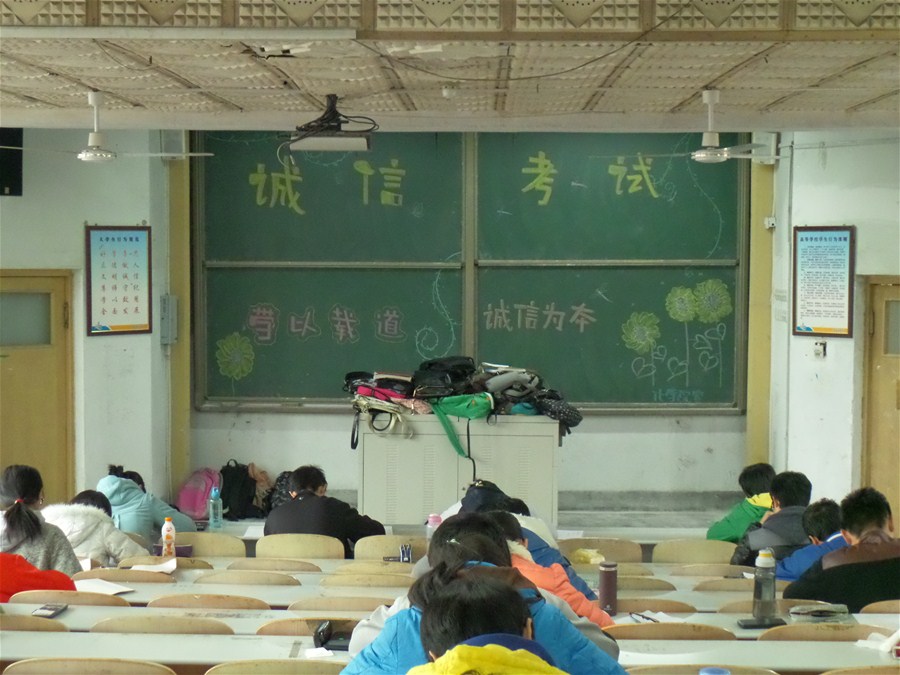 本次中期考试之前,学院向一年级的团支部发出了申请诚信考场免监考的通知后,共用有6个团支部提出申请,有的班级还专门召开了关于免监考试的主题班会,对免监考试的意义和大学生应该如何看待考试进行了讨论。在考试前,申请无人监考的班级全体成员都进行了诚信宣誓,同学们自觉地将书、资料、手机等放在讲台上,诚信考场里,没有看到一位老师,也没有看到有任何同学翻书偷看,交头接耳。考场里的每位同学都很珍惜这份信任,都不愿意给班级这块牌子抹黑,特别自觉。考试结束后,同学们反应,没有老师的监督,考试过程中大家比平时放松好多,以前紧张压抑的气氛没有了,思维也更加流畅了。还有同学表示这样的考试形式非常好,体现了学院对我们大学生的信任,同时也是我们对自己的一次监督和考验。