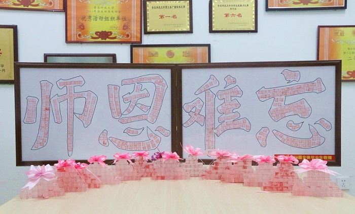 饮水思源,师恩难忘。2016届毕业生即将离别母校,踏上新的征程之际,化学院领导、老师与毕业生合影留念,并为每位毕业生准备了一份特殊的礼物——专属纪念印章。毕业生用自己的姓名印章在宣纸上拼写出“师恩难忘”四个字,作为毕业生送给学院的礼物,表达出毕业生对老师的感恩之情和对母校的深深祝福。