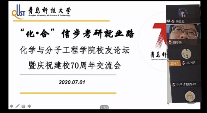 为帮助大三学生明确目标、掌握考研技巧,将最初的化学梦与就业、考研结合起来,7月1日,吃瓜网官网举办了“化合--信步考研就业路”校友讲坛暨庆祝建校70周年线上交流会,校团委副书记张玉、化学院副院长胡志强、化学院党委副书记杨小明参加了本次交流会。