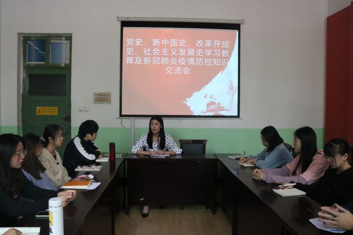 10月6日下午,程丽老师举办了党史、新中国史、改革开放史、社会主义发展史学习及新冠肺炎疫情防控知识交流会,王茗永通过PPT对四史和疫情防控进行了讲解,随后每位党员都发表了自己的见解,学生党员表示:历史是最好的教科书,是党员干部最好的营养剂,从历史中汲取的智慧与精神,是抗击疫情取得显著成就的根本保证。