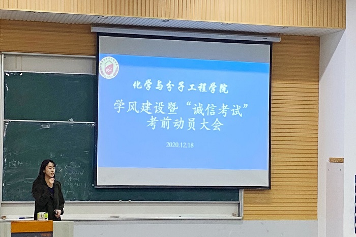 为进一步激发同学们备考的积极性,加强考风考纪建设,营造公平公正的考试氛围,化学院2020级于12月开展学风建设暨“诚信考试”系列教育,2020级辅导员陶亚亚老师组织了此次教育,化学院全体2020级学生参与。