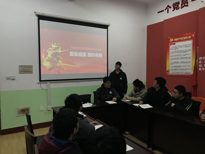 11月7日,化学院2020级学生以班级为单位进行了国防知识学习,加强了同学们对国防知识的了解;11月15日,2020级各班代表参与了“爱我国防 国防有我”国防知识竞赛,进一步增强了同学们对国防知识的学习热情,形成了良好的国防氛围。随后,各团支部召开了“强国防教育 展青春风采”主题班会,讲述自己身边的国防故事,用生动形象的例子再次强调了国防对于青年学生的重要性。邀请老师为学生做专题报告,开展国防教育形势与政策讨论会,征兵政策宣讲会,让学生了解国家、学校的征兵政策,正确认识现在的大环境,正确的表达爱国热情。