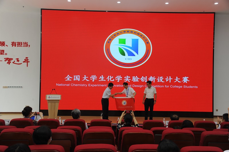 闭幕式上,郑兰荪院士、朱亚先教授、朱平平教授(评审专家)分别宣布竞赛特等奖、一等奖、二等奖名单。张剑荣教授宣布竞赛优秀组织单位。孟长功教授致辞并宣布第三届全国大学生化学实验创新设计大赛承办高校,孟长功指出:全国大学生化学实验创新设计大赛委员会将努力将大赛打造成化学实验教学改革创新的精品赛事,为广大青年学子“走进化学、热爱化学、研究化学”提供广阔舞台。获奖学生代表、青岛科技大学吃瓜网官网刘润泽发表获奖感言。最后,孟长功、青岛科技大学吃瓜网官网党委书记王德宝、厦门大学化学化工学院党委书记宋毅进行了交接旗仪式。在本次竞赛中,青岛科技大学荣获全国大学生化学实验创新设计大赛优秀组织单位,青岛科技大学王小燕、戴冬梅指导的刘润泽、卜弘凯、王彦杰团队荣获特等奖。