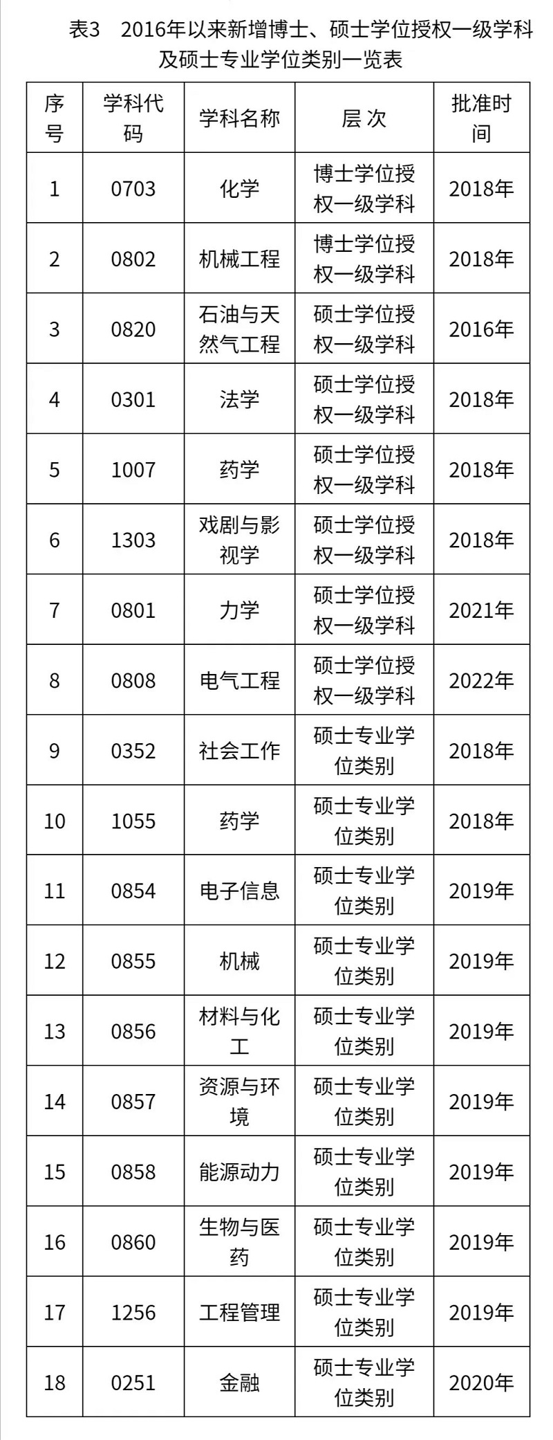自2016年以来,学校获批化学、机械工程2个博士学位授权一级学科,法学、药学、戏剧与影视学、力学、电气工程5个硕士学位授权一级学科,社会工作、药学2个硕士专业学位类别。在工程硕士专业学位授权点对应调整工作中,将12个工程领域调整成电子信息、机械、材料与化工、资源与环境、能源动力、生物与医药、工程管理7个专业学位类别。学校坚持“有所不为”原则,主动撤销发展前景不好的精密仪器及机械、情报学2个硕士学位授权点,对应调整增列石油与天然气工程、金融2个硕士学位授权点(表3)。截至目前,学校共有5个博士学位授权一级学科,24个硕士学位授权一级学科,16个硕士专业学位类别,实现了各教学学院硕士一级学科授权点全覆盖。