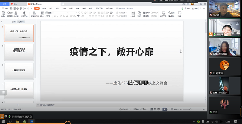 11月5日-6日,化学院全体班主任通过腾讯会议等线上方式召开“化学与疫情”主题班会,引导青年学生认清当前青岛市、学校疫情防控局势,充分认识到国家疫情防控“外防输入、内防反弹”总策略和“动态清零”总方针的必然性,真正做到“防疫不懈怠,防护不放松”。同时,住校辅导员老师通过走访学生宿舍、下沉教室了解同学们的学习工作生活。