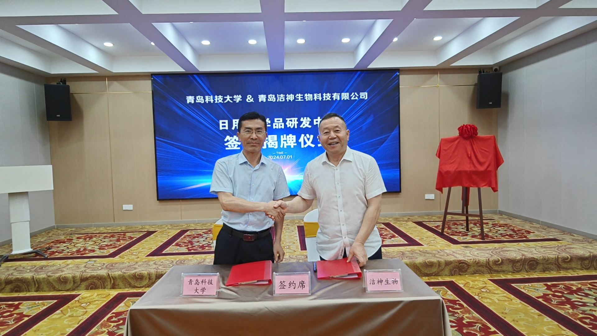 7月1日,化学院与青岛洁神生物科技有限公司日用化学品研发中心签约揭牌仪式在洁神智慧管理园区举行,学院党委书记肖强、常务副院长汪恕欣、青岛洁神集团董事长孙善家、青岛洁神生物科技有限公司总经理刘晓静、李沧区振华路街道党委书记刘国宁、学院副院长胡志强、教师代表、辅导员代表、青岛洁神生物科技有限公司相关负责人、李沧区振华路街道相关工作人员等10余人参加活动。