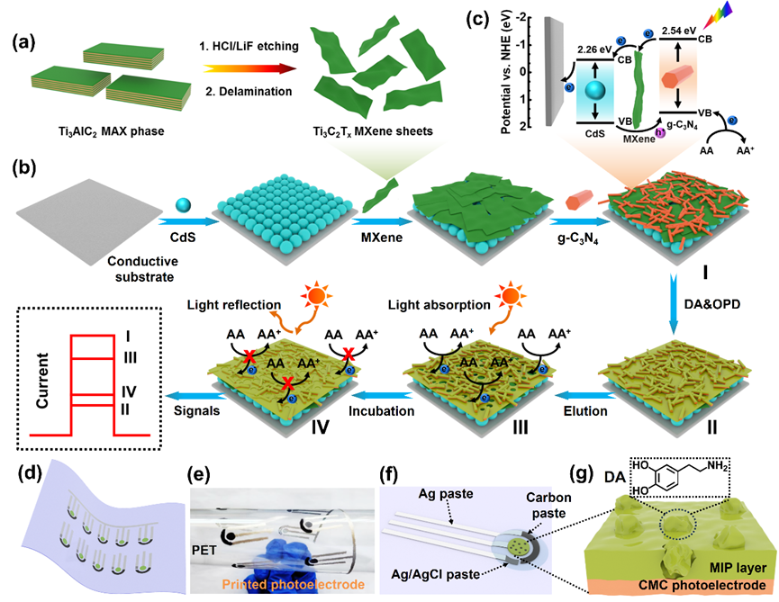 综上所述,本工作通过丝网印刷将CMC电极与MIP层集成到柔性PET基底上来实现实时、非侵入性的DA监测。由于在CdS量子点和g-C3N4之间集成了高导电性且柔性的MXene,并进行了适当的能级匹配,相较于传统的光电材料,CMC电极不仅在界面处形成了内建电场,促进了电子-空穴对的分离效率,还良好的柔性,可以实现实时、非侵入性的DA检测。因此,这项工作成功地证明了用于灵敏DA检测的柔性PEC传感器的可扩展开发,在实时和无创医疗监测领域将拥有巨大的应用前景。