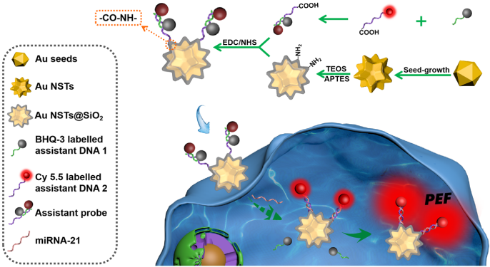 图2 基于金纳米星的新型等离子体增强荧光纳米探针用于细胞内miRNA-21的高灵敏原位成像检测示意图。图片来源:Anal. Chem.