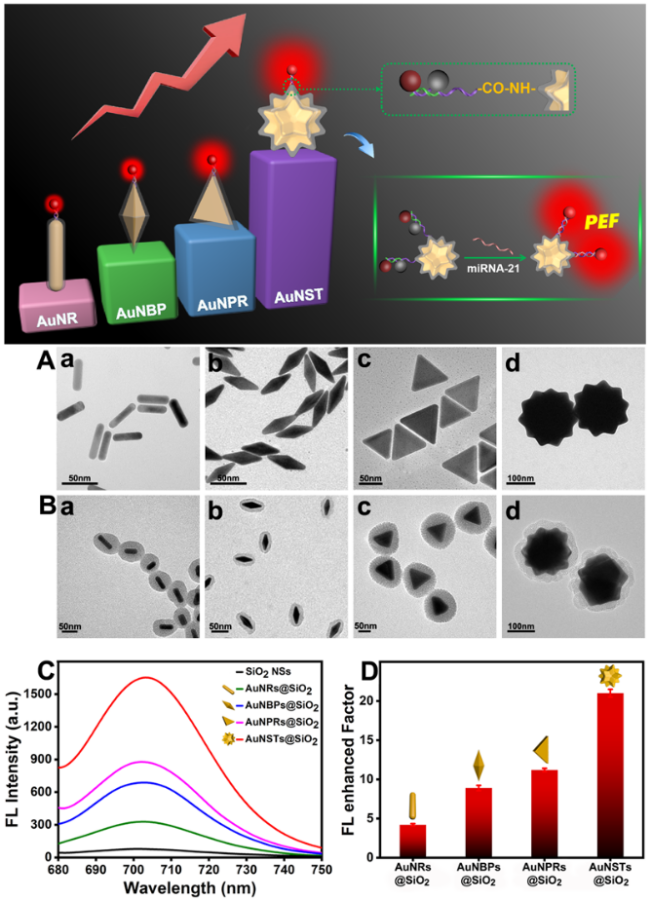 相比于传统的等离子体增强荧光基底材料(金纳米棒、金纳米双锥体和金纳米三角片等),含有20个对称尖端的金纳米星具有更多的局域等离子体电场热点“hot spots”而显示了更优的等离子体增强荧光效果(图3所示)。该工作为新型等离子体增强荧光纳米探针的设计以及低丰度肿瘤标志物的高灵敏检测提供了新思路。