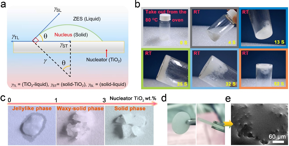 本工作引入了结晶高熵共熔材料的概念,构筑了一种新型的具有优异离子电导率的锌固态电解质。成核剂的使用不仅参与构建界面离子渗流通道,还可大幅度增加相变材料的结晶位点数量,调节其成核动力学,使成核温度和整体结晶速率显著提高。该巧妙的设计为增强多价固态导体的离子传输动力学提供了新的认识,也为新型多价固态电解质的开发提供理论支撑。