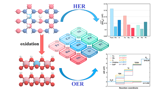 该工作通过密度泛函理论计算,详细、系统地探讨了第八族元素掺杂、表面羟基化、表面氧化对磷化钴全解水电化学活性的影响,阐明了表面氧化对于磷化钴OER活性的增强机制。计算表明,CoP催化的HER是由Volmer-Heyrovsky机制主导的,并且可以通过稳定的Rh、Pd替代掺杂调控电荷转移、d带中心位置进而调控得到最合适的氢吸附吉布斯自由能变,增强HER活性。同时选择适当的掺杂元素可以降低羟基化程度,提高HER效率。这为电催化剂的设计提供了理论基础和实验设计依据。该研究成果的第一作者是化学院2020本科生卜弘凯,通讯作者为高洪涛教授。
