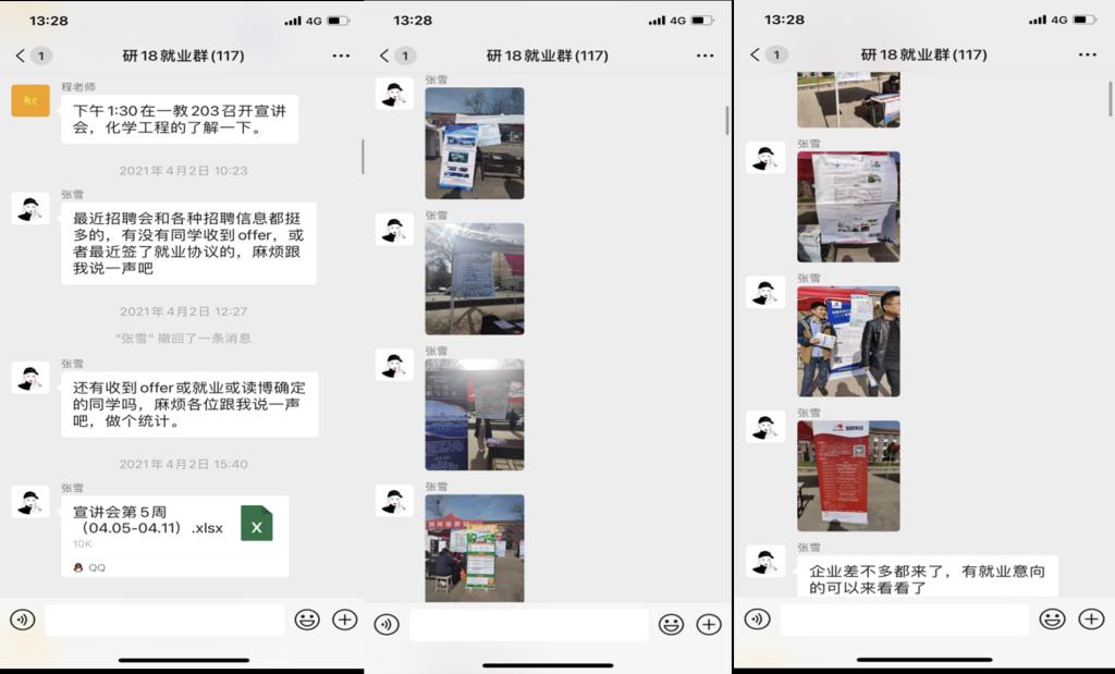 化学就业助理张雪(党员)建立了就业考试群和企业就业群,推送相关考试招聘信息108条、相关就业信息154条。党员李志远、王一盟等学生干部及时整理转发就业信息,给予同学就业意见。其余党员同志在保证自身就业的基础上,主动关注身边同学的就业情况,积极把企业招聘信息推荐给未就业的同学。