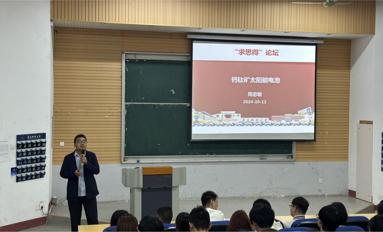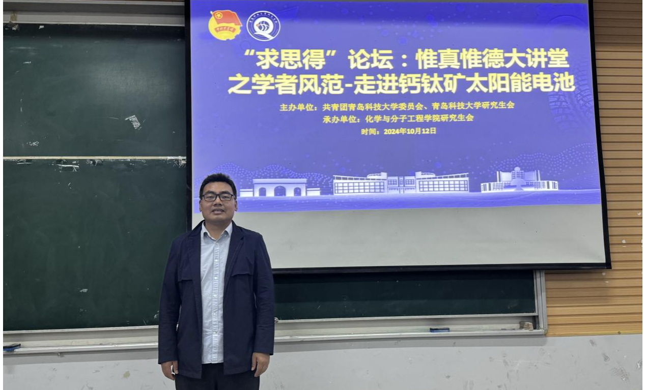 为开拓化学院研究生学生视野、增强学生科研意识,2024年10月12日下午4点化学院研究生会于四方校区第二教学楼101室开展“求思得”论坛:惟真惟德大讲堂之学者风范——走进钙钛矿太阳能电池榜样分享报告会。青岛科技大学博士生导师,山东省“泰山学者”青年专家周忠敏教授应邀出席。报告会由刘凯昱主持,化学院本科生与研究生同学积极参与本次报告会。