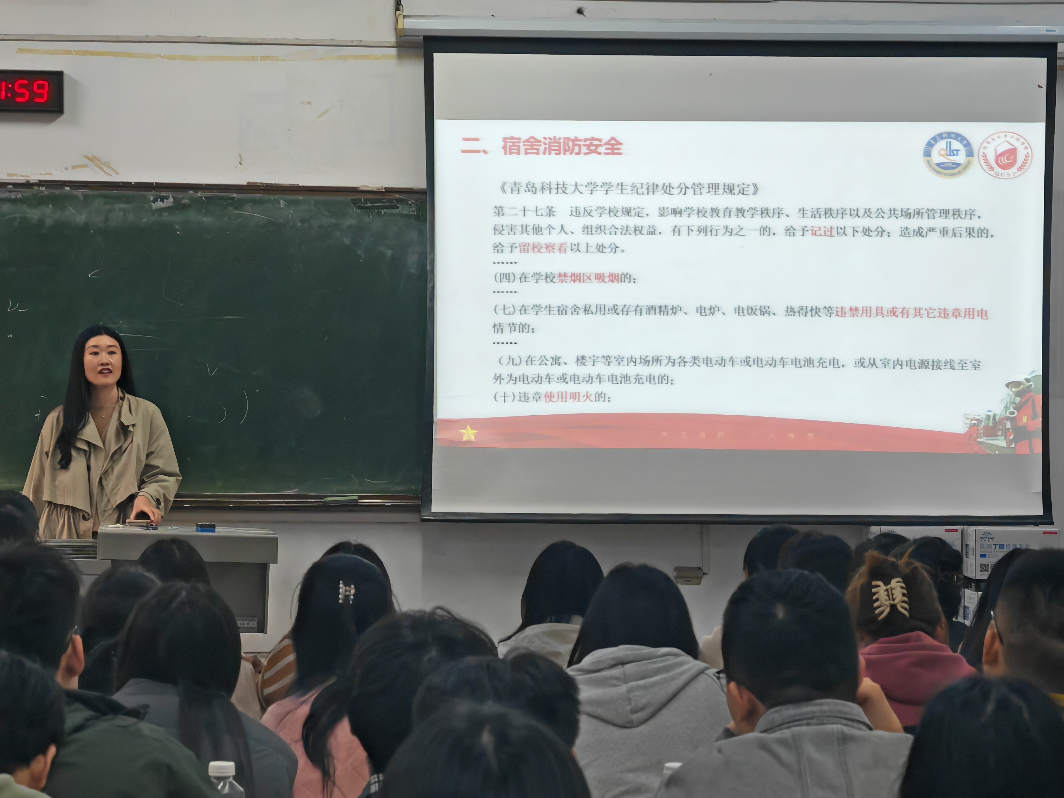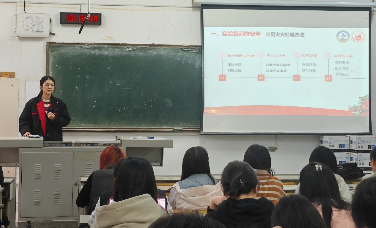 班会伊始,徐鑫以火灾案例为切入点,从实验室与宿舍两方面展开全面深入的消防安全知识宣传教育,详细讲解火灾成因、火灾预防以及逃生自救方法等多个方面。她强调,消防安全无小事,应当时刻保持警惕,积极学习并实践消防安全知识,共同营造一个安全和谐的学习与生活环境。