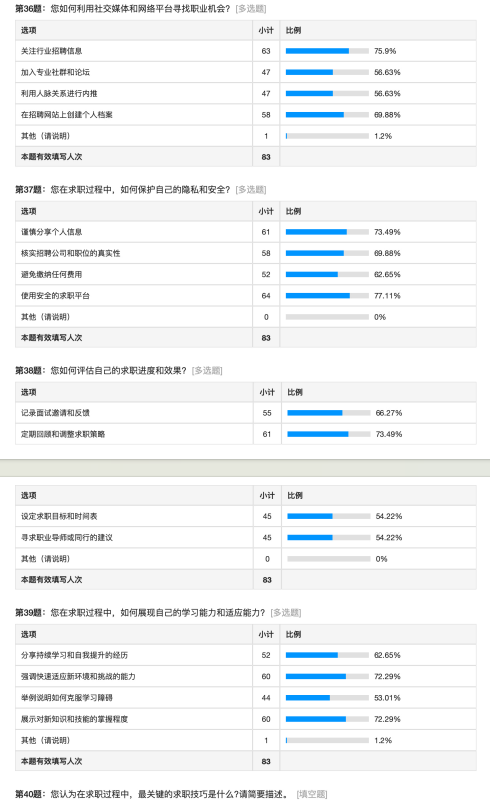 活动伊始,研究生会权益部精心准备并发放了调查问卷。随后,广泛收集了同学们对于就业问题的关注点和意见。这一举措不仅为同学们提供了一个表达就业困惑和期望的平台,也为学院今后的就业指导工作提供了宝贵的数据参考。