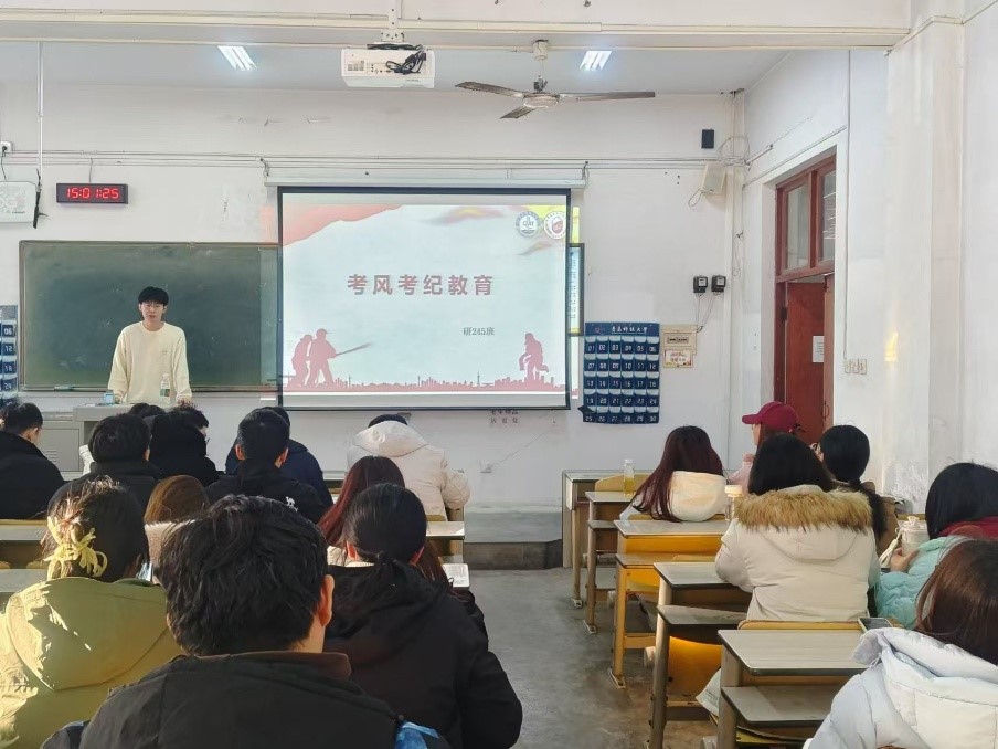 为进一步加强研究生的学术诚信建设、考风考纪教育,引导学生树立正确的考试观念,提高诚信意识,在12月16日研究生骨干诚信教育结束后,化学院研2024级各班近期通过多渠道、多形式开展考风考纪主题班会,倡导诚信应考。