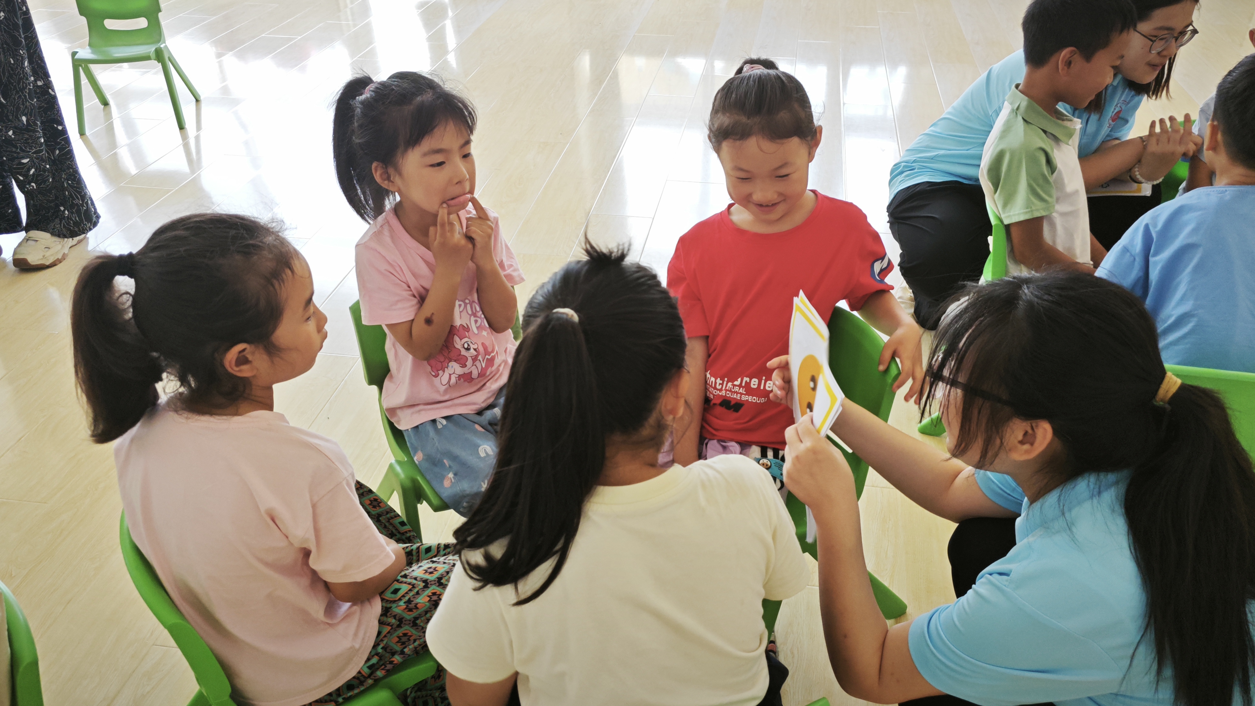 在“情绪传递小剧场”环节,志愿者向孩子们展示了写有“开心”、“难过”、“生气”等情绪的卡片。孩子们以五人一组的形式随机抽取卡片,并通过表情和动作来演绎所抽到的情绪。小演员们各展所长,有的通过手舞足蹈来表现“开心”,有的则通过耷拉嘴角、眼眶泛红来诠释“难过”。生动的表演引发了周围小朋友的阵阵猜测与讨论。通过这种沉浸式的体验方式,志愿者帮助孩子们直观地了解了不同情绪的外在表现形式,教会他们用更清晰的方式表达自己的内心世界。