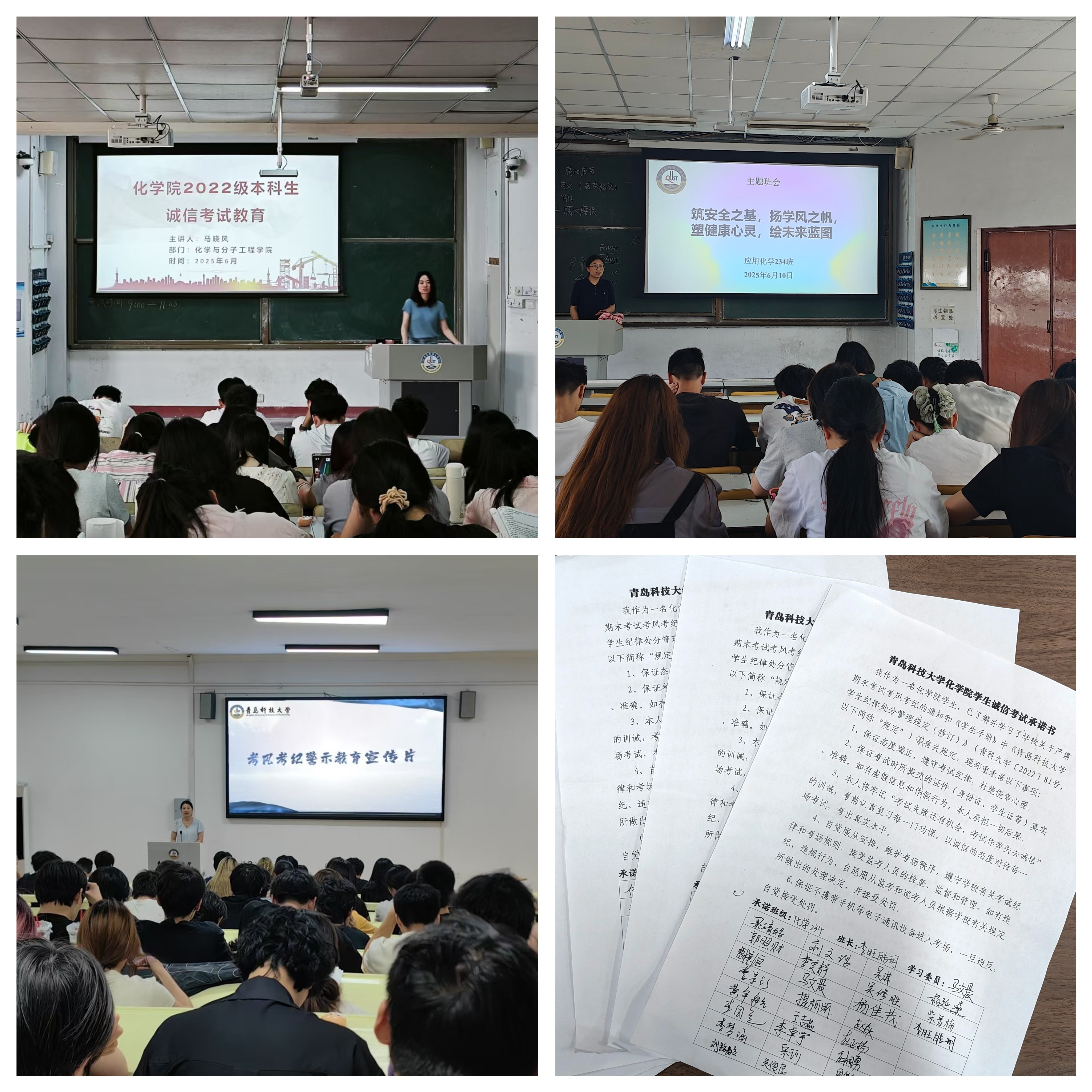 各年级辅导员和班主任借助年级大会、主题班会、走访宿舍等形式,开展考风考纪诚信教育。阐明诚信应考的意义,结合《青岛科技大学学生纪律处分管理规定》,向同学讲明考试违纪行为的严重后果,引导学生树立正确的考试观念,自觉抵制任何形式的作弊行为,让诚信意识内化于心、外化于行,共同营造公平公正的考试氛围。