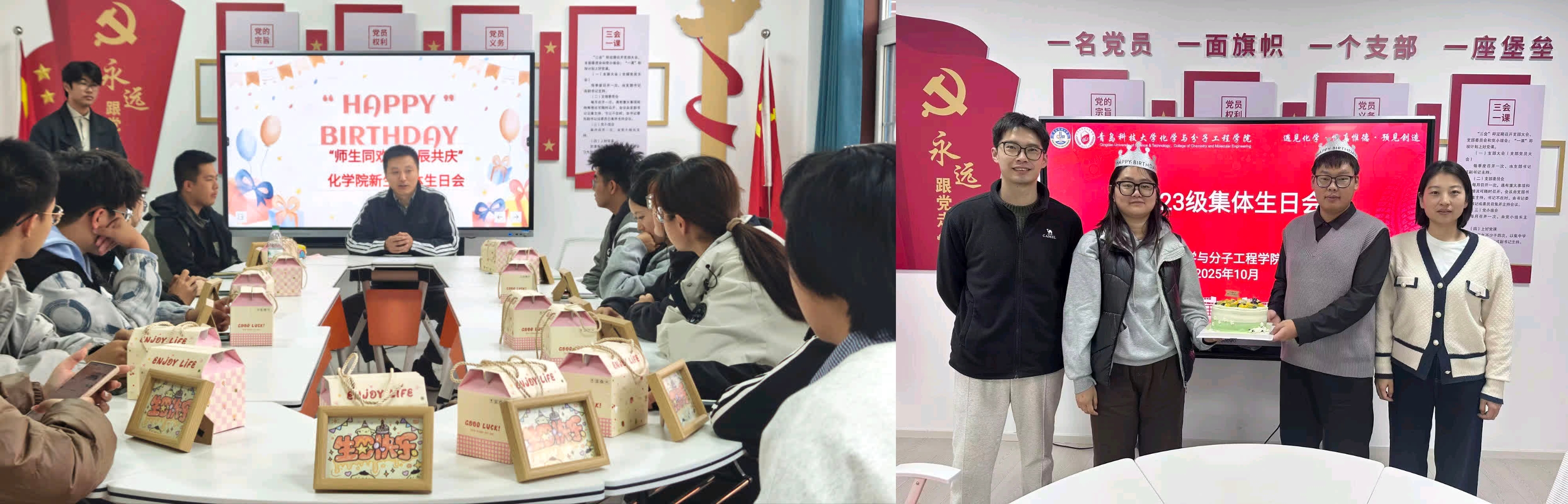 “师生同欢庆生辰,温情满溢暖化院。化学院学工班主任兼团委书记闵繁盛、23级本科生辅导员昝祺祺、刘涛为10月下旬过生日的同学举办集体生日会活动。大家在破冰游戏中开怀畅玩,在礼物发放环节收获惊喜,更在师生共庆生辰的温馨氛围里,感受化学院大家庭的温暖与老师的深切关怀。