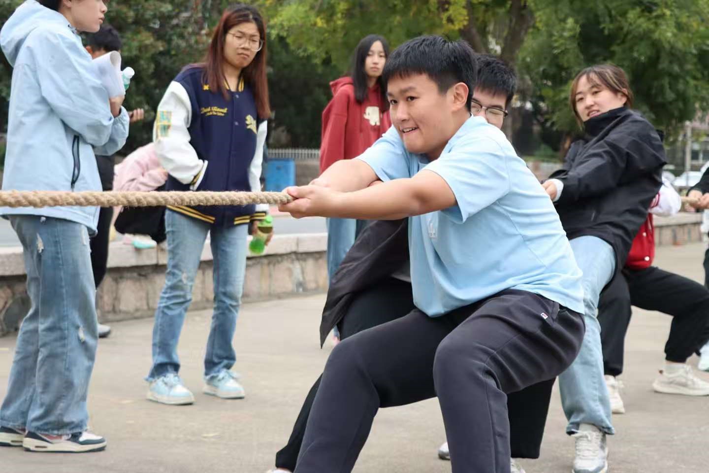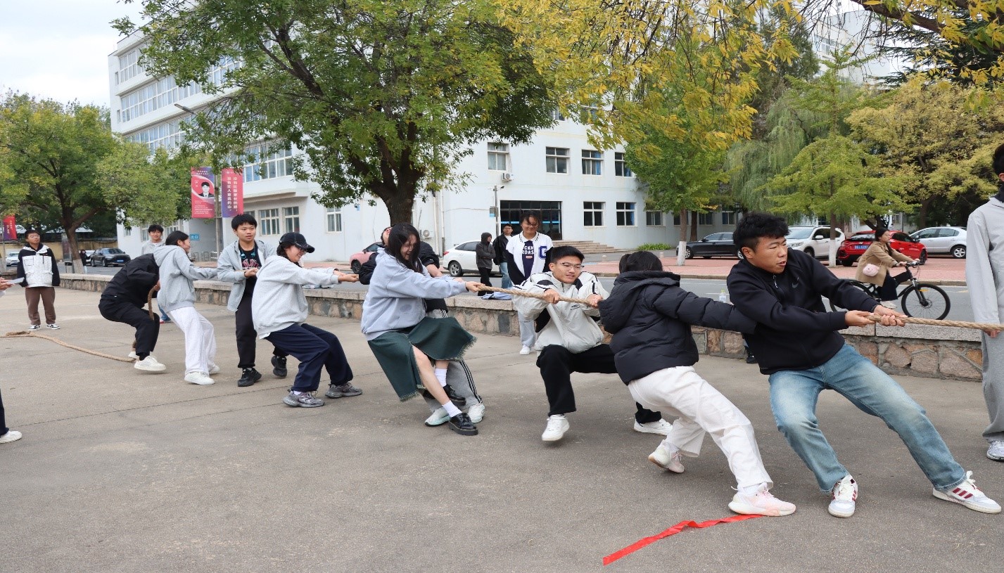 为响应“爱体育,兴科大”校园体育文化号召,丰富校园文化生活,展现班集体卓越风采,增强班级凝聚力,化学院于2025年10月19日在小五四广场组织2025级学生开展了一场热血沸腾的拔河比赛。本次比赛以班级为单位进行角逐,14支队伍踊跃参赛,每支队伍由5名男生和4名女生组成,通过抽签分组确定比赛顺序。