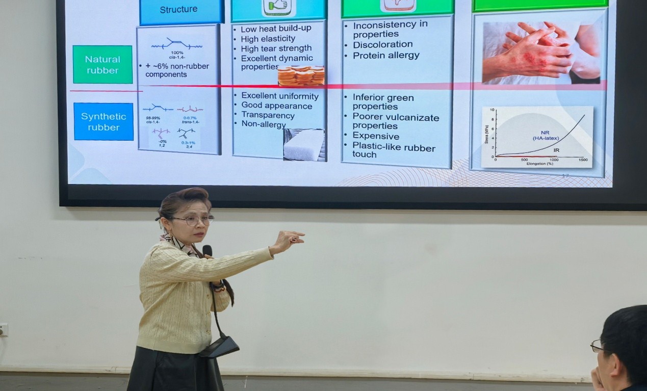 陳麗華教授以自身丰富的学术经历为引,分享其在科研工作中的路径探索、难题攻克与跨界协作的经验与思考,为同学们提供极具方法论启示与实用价值的成长指引。在专业分享环节,陳教授以天然橡胶研究为范例,重点展示其团队在推动绿色弹性体开发与循环制造方面的创新实践。这些成果不仅为应对行业环保挑战提供新路径,更生动诠释绿色化学的创新理念与发展方向。