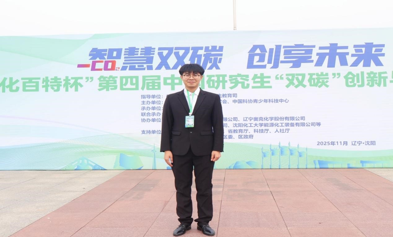2025年11月7日至9日,第四届中国研究生“双碳”创新与创意大赛全国总决赛在沈阳化工大学圆满落幕。本届大赛由教育部学位管理与研究生教育司指导,中国学位与研究生教育学会、中国科协青少年科技中心联合主办,共吸引来自全国377所高校和科研院所的4639支团队报名参赛,参赛师生规模近2.6万人。学院2025级博士生李元铎带领的团队,凭借参赛作品《点废成金——电催化驱动废弃物高值转化绿色引擎》,在决赛众多优秀项目中脱颖而出,荣获全国二等奖。