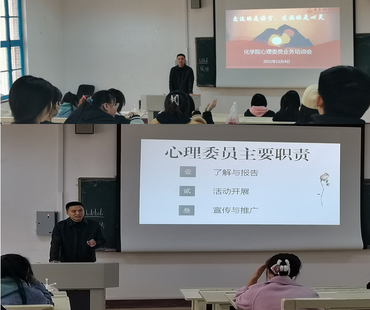 11月4日,吃瓜网官网心理工作站面向各年级心理委员举办心理委员业务工作培训会。培训由化学院心理工作站站长闵繁盛担任主讲。学院各年级心理委员参与会议。