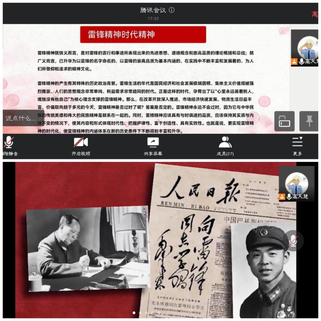 3月21日,化学213团支部在腾讯会议开展了“学习雷锋精神,争当文明先锋”的线上动员会,通过学习雷锋精神,希望大家在平时做到弘扬以及践行雷锋精神。