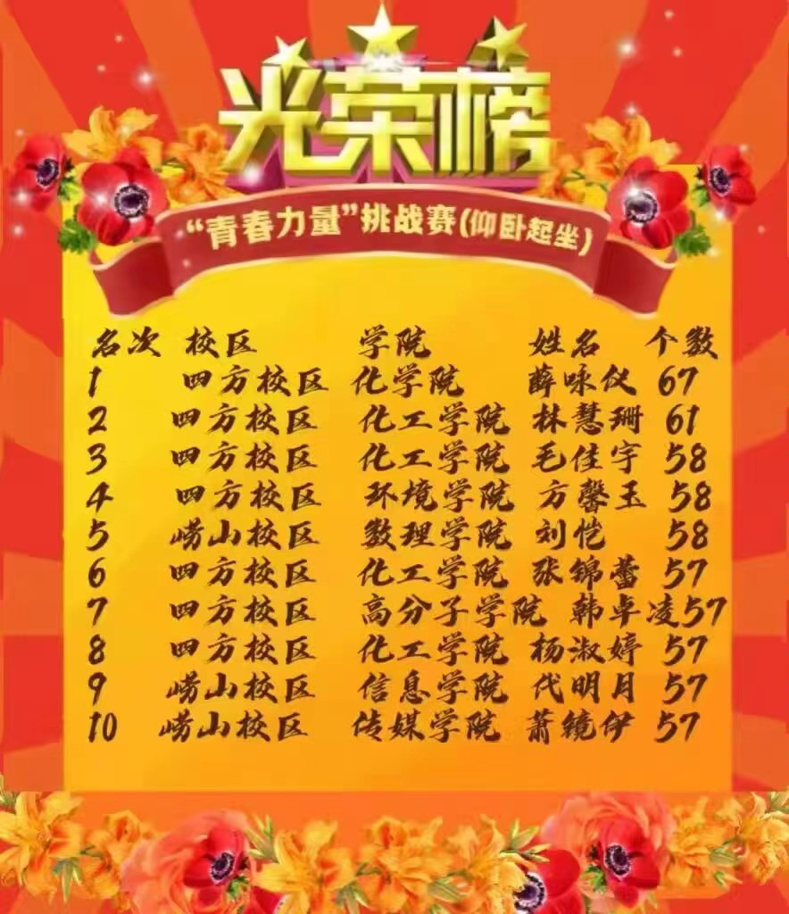 10月20日,青岛科技大学体育联盟组织召开青春力量挑战赛,吃瓜网官网薛咏仪同学以67个仰卧起坐的优异成绩拿下“青春力量”挑战赛(仰卧起坐)的第一名。
