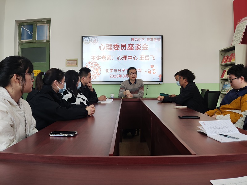 3月14日,“快乐、健康、成长”化学院危机干预班级心理委员座谈会在党建活动室举行。学校心理中心王岳飞老师进行工作辅导,学院党委副书记杨小明、学院心理委员代表参加座谈会,学院心理工作站站长闵繁盛主持。