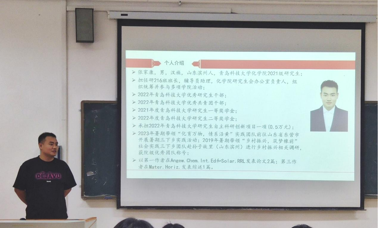 2023年9月21日8:00,化学院研究生于一政243开展研究生会骨干竞选会议,化学院全体研究生会成员及化学院研究生辅导员程丽老师参与此次活动,张家康担任主持人。