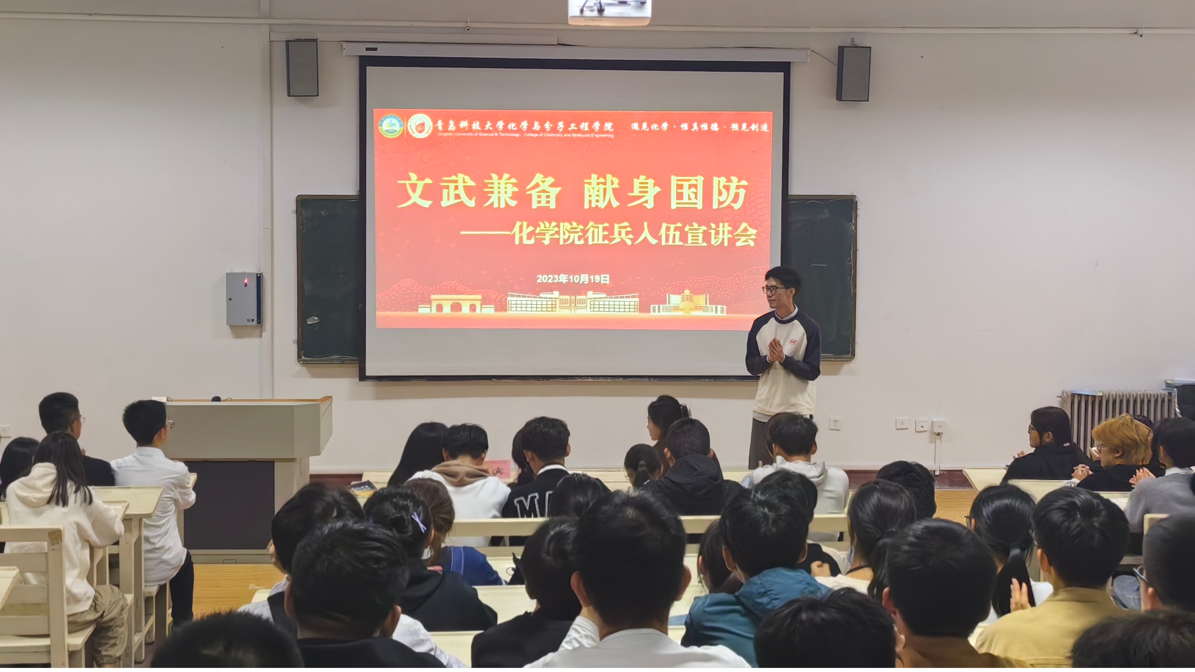 为进一步贯彻落实国家征兵政策,积极动员青年学子携笔从戎,10月19日晚19:00,化学院于一政243教室召开征兵宣讲会,“爱我国防”演讲大赛获奖者陈雯雯、海洋学院佘涵诺、李世博、臧伟亮以及化学院退役大学生士兵吕文凯、受邀参与宣讲,学院2020级、2023级100余名同学参加宣讲会,宣讲会由2023级辅导员刘涛主持。