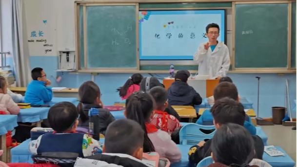 科普课堂上,团队成员先从“什么是化学变化”向小学生们科普生活中的化学知识,然后讲到生活中的衣、食、住、行每样都离不开化学,让孩子们发现“化学”的有趣,激发同学们对化学知识、科学知识的热爱。