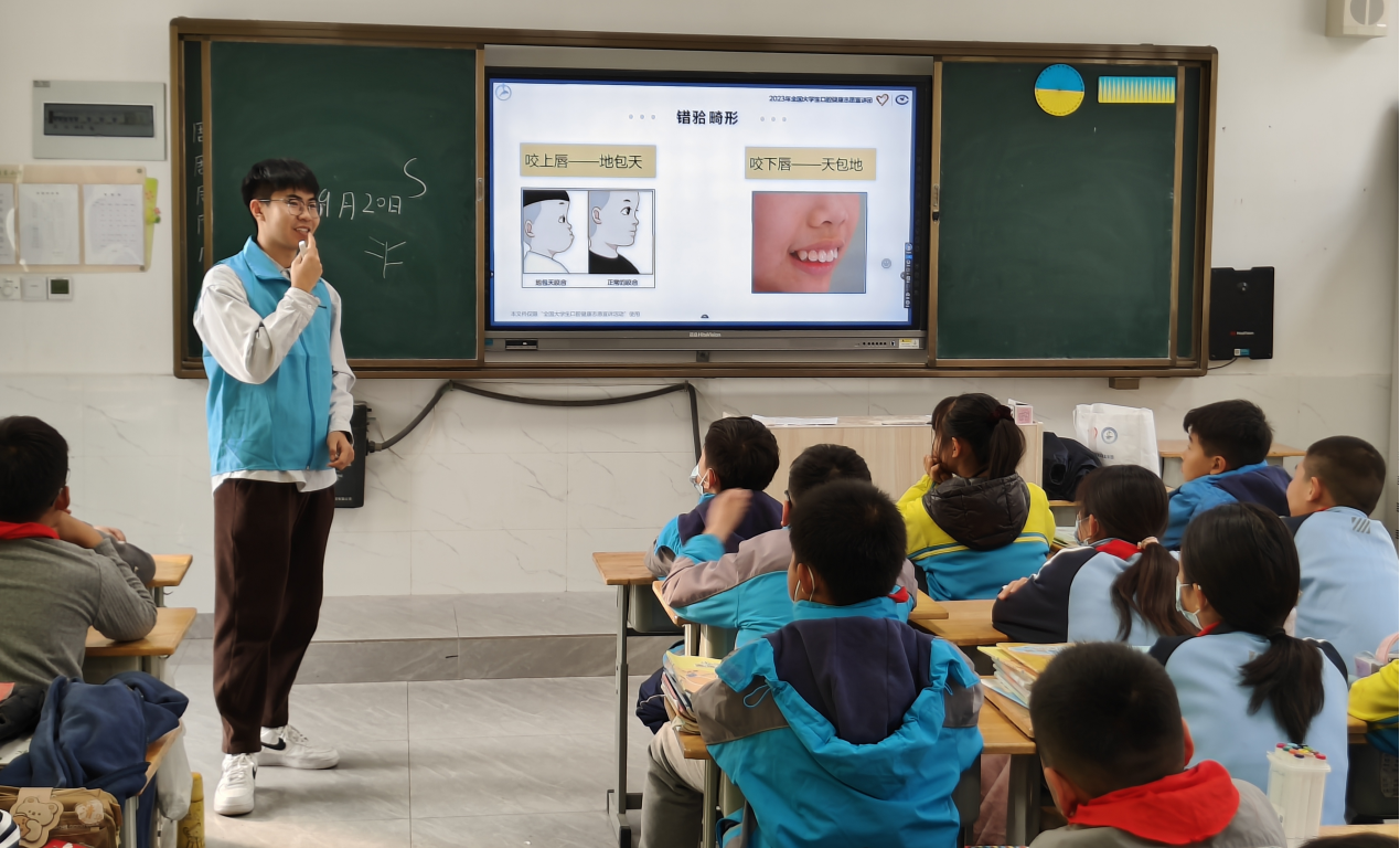 2023年11月22日,2023年全国大学生口腔健康志愿宣讲团——青岛科技大学吃瓜网官网“牙乐乐”志愿服务队于青岛市胶州市胶东小学六年级开展首次宣讲活动。