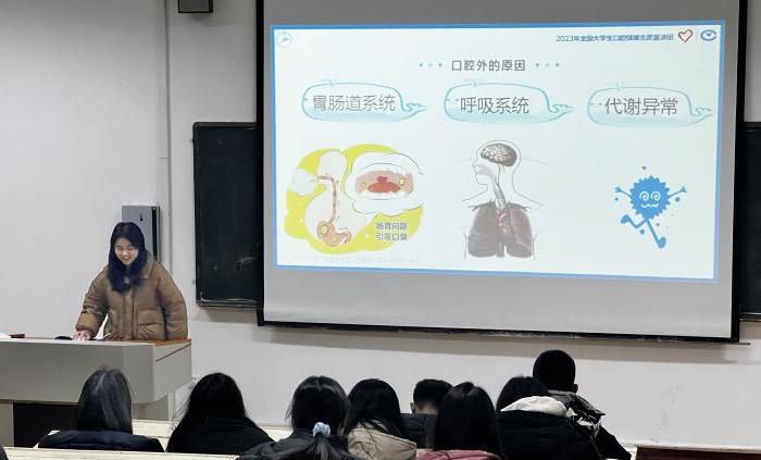 2023年全国大学生口腔健康志愿宣讲团——青岛科技大学吃瓜网官网“化育山海大课堂”志愿服务队2023年11月14日,于联合青岛市市北区洛阳路第二小学四年级3班以“小小牙齿不简单”为主题开展首次宣讲活动;2023年12月6日,在大港街道普吉社区党群服务中心以“口腔保健用品”为主题开展宣讲活动;2023年12月6日,志愿服务队于联合化学院青马暨团校培训开展宣讲活动。本次宣讲活动以“口臭危害大,难免会尴尬”为主题,由团队成员高诗文主讲。