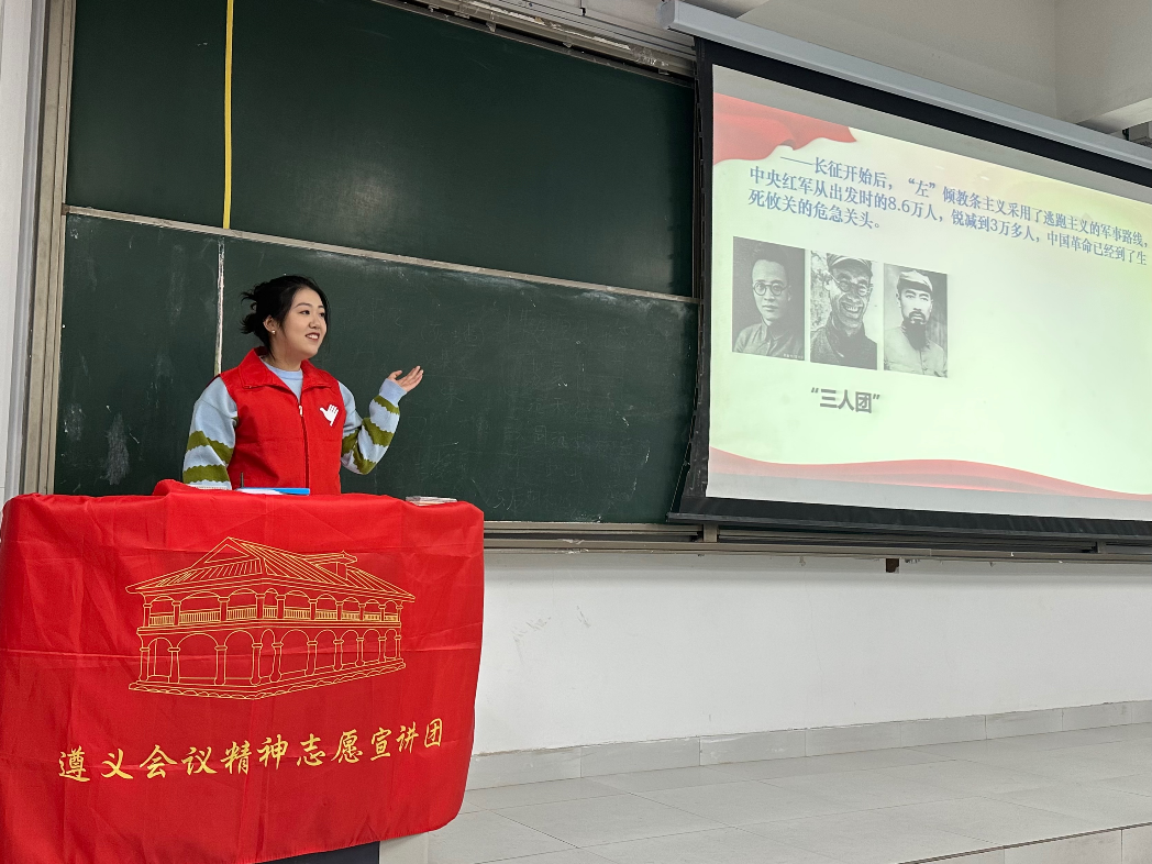 习近平总书记说过:“中国共产党的伟大不在于不犯错误,而在于从不讳疾忌医,敢于直面问题,勇于自我革命,具有极强的自我修复能力。”遵义会议便是一次刀刃向内的壮士断腕、刮骨疗伤。宣讲团成员臧欣然以“提到遵义会议,大家心中最先想到的是什么?”的疑问开讲,整个宣讲分为两部分:遵义会议的基本过程和历史意义、遵义会议精神主要内涵和重要启示,在讲述整个遵义会议前后历史背景后,引出遵义会议精神的具体内容,剖析遵义会议精神在新时代中的重要地位和实际内涵,以及如今的青年者能从遵义会议和遵义会议精神中学到什么。