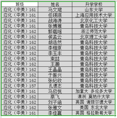 2020级毕业生考研再获佳绩,有20人考取研究生(其中5人获得国外名校读研offer),其中应用化学(中美)162班长张纪收因成绩优异获得推免青岛科技大学化学直博生,应用化学(中美)161班团支书马文珺推免至山东大学晶体材料研究所攻读研究生,应化化学(中美)162班王灏入选青岛科技大学第22届研究生支教团,将前往宁夏回族自治区彭阳县进行为期一年的支教志愿服务活动。应化化学(中美)161班张博雅获推免攻读青岛科技大学研究生。